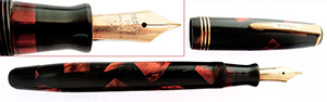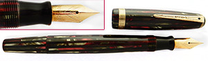 Parker Challenger de luxe, USA, c. 1938, tapered clip engraved Parker, three ring cap bands, “chunky” luminous red and black marble celluloid, clip screw and blind cap were in black plastic. The nib is of14 kt solid gold imprinted Parker, fine point with perfect iridium tip, on the barrel crisp imprint Parker Deluxe Challenger, Made in USA, Parker Pen Co, Janesville Wis, button filling. Length closed 13 cm, posted 15.8 cm. Excellent condition, very atractive pen #2671 $USD 160 |