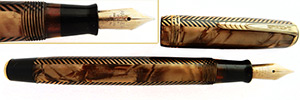 Parker Royal Challenger Golden Herringbone, USA, 1938, top of the line, gentleman size, color is in golden tiger eye pearl marble with herringbone pattern, tapered clip, with the imprint Parker and a stepped design, like five spades lying upside down on top of each other, three cap bands. Both the clip and the celluloid pattern were designed by Paul M. Ressinger, one of the best known industrial designers of Chicago. Doble black jewels y triple ring cap bands. Section with a transparent band which allows to check the ink level when is too low. Button filling, on the barrel crisp imprint "Parker Royal Challenger 8. Geo S. Parker Made in USA". Length capped 5 1/8". Original Parker nib of solid gold "Parker pen Made in USA 27". Excellent condition, new sac, very appealing color and pattern. #1925 $usd 260 |