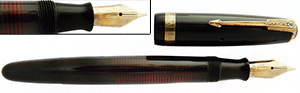 Parker striped Duofold vacumatic, USA, 1945, striped celluloid alternating grey with red and black bands with transparent stripes so one can check the volume of ink in the barrel, blue diamond on the clip, chevron pattern on the wide gold plated cap band, on the barrel engraved Parker Duofold 5 made in USA, 14 kt gold nib with Vs design and imprinted Parker pen made in USA, vacumatic filler, plastic plunger. Length capped 137mm, diameter 14mm. Very good #1648 USD 150 |