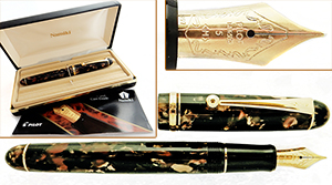 Sailor 1911, Japón, pluma de resina negra brillante decorada con diseño floral en técnica de maki-e, clip y adornos enchapados oro,en la bandadel capuchón grabado “Sailor Japan founded 1911”, carga a cartucho o convertidor, pluma de oro macizo 14 Kt trazo medio firme. Longitud cerrada 13.7 cm, posteada 15 cm, diámetro 14 mm. Nueva sin uso en estuche original de madera acondicionado con terciopelo violeta, con certificado y convertidor #2882 Reservada |