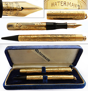 Waterman 42 (0542), Italia, c. 1934, estilográfica "safety", en ebonita recubierta con coraza enchapada oro 18kt con diseño de hiedra dentro de rombos, en el capuchón grabado Waterman´s 18 Kt R, con anillo para colgar, plumín Waterman´s Ideal de oro, trazo fino, excelente estado, solamente unas marcas de herramienta en la perilla del extremo del cuerpo. Este elaborado modelo aparece en el catálogo de Cavaliere, que era la compañía representante de Waterman en Italia y que controlaba estrictamente la producción de estas corazas oficiales de Waterman. Muy bien #518 $USD 450 |