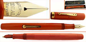 Waterman 54 Cardinal EEUU, 1920s, goma dura rojo "cardenal", nítido grabado en el cuerpo "Waterman´S Reg US Ideal Pat off.Fountain pen", suave plumín Waterman´s Ideal número 4 trazo medio, carga a palanca. Moderado desgaste del baño de oro en el extremo del clip, nítido grabado 54 en el extremo del cuerpo, excelente #522 $USD 450 |